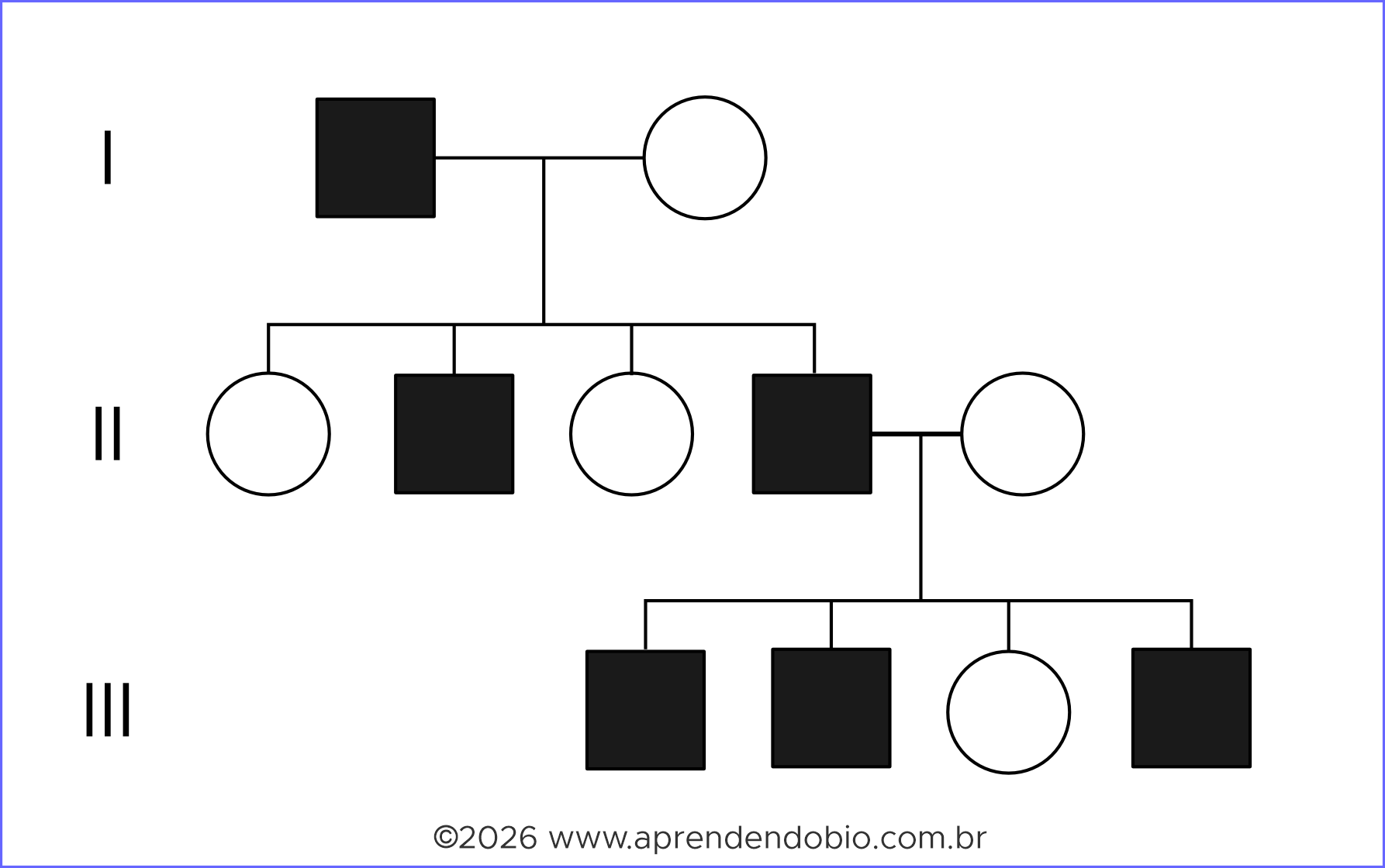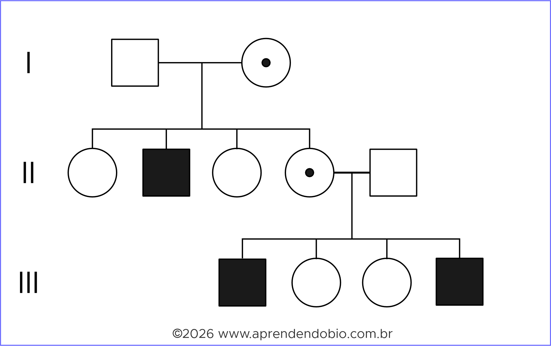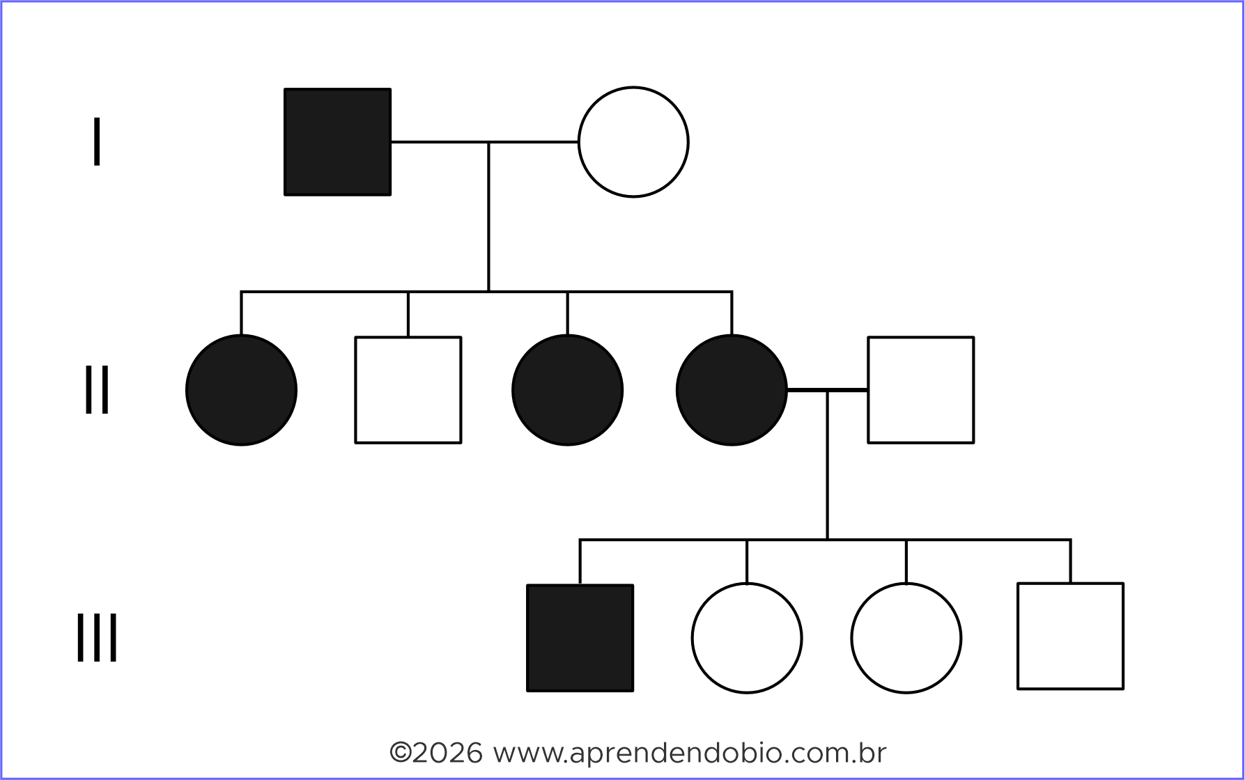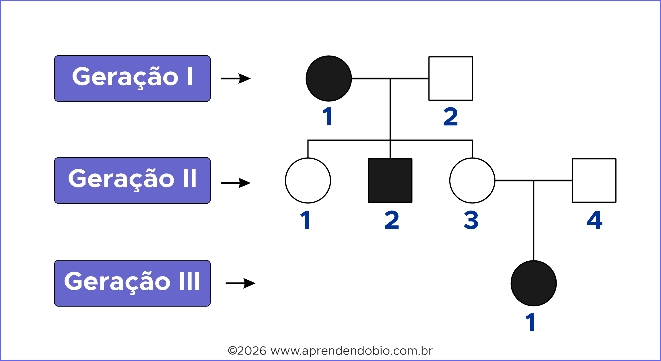 Na Figura 2, a organização por gerações e indivíduos aparece de forma explícita. A geração I reúne os indivíduos mais antigos do diagrama. A geração II corresponde aos seus descendentes imediatos. A geração III reúne os descendentes da geração II. Essa convenção permite localizar rapidamente qualquer indivíduo do heredograma e sustenta toda a análise posterior.