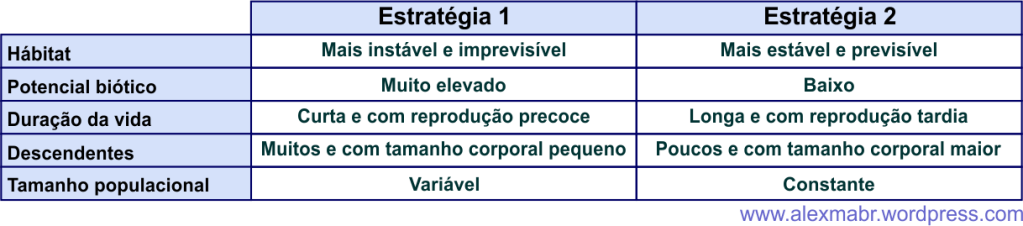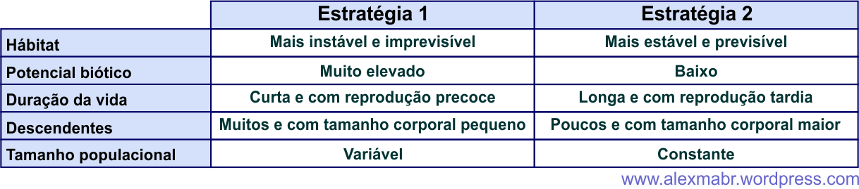 As estratégias apresentadas na tabela correspondem aos dois extremos em relação às adaptações dos organismos aos ambientes onde vivem. Os seres adaptados a ambientes instáveis e com competição reduzida, são denominados estrategistas r. Essas espécies apresentam altas taxas reprodutivas (potencial biótico elevado), produzem grande número de descendentes (pois a taxa de mortalidade nas fases jovens é acentuada), têm ciclo de vida e tamanho corporal reduzido. Os estrategistas r também se caracterizam por apresentar mecanismos de dispersão eficazes, o que os torna bons colonizadores.