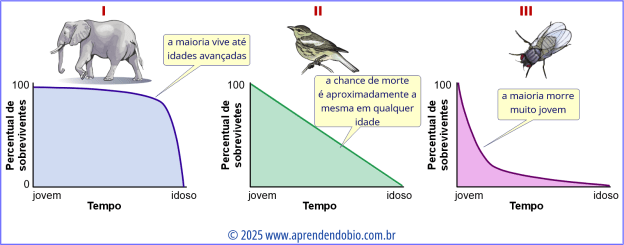 Para representar essas variações, os ecólogos utilizam as chamadas curvas de sobrevivência. Essas curvas são gráficos que mostram, de forma visual e comparativa, a proporção de indivíduos sobreviventes em diferentes idades, desde o nascimento até a idade máxima da espécie. Com elas, é possível identificar se a mortalidade ocorre de forma concentrada no início da vida, distribuída uniformemente ao longo do tempo ou intensificada apenas na velhice.