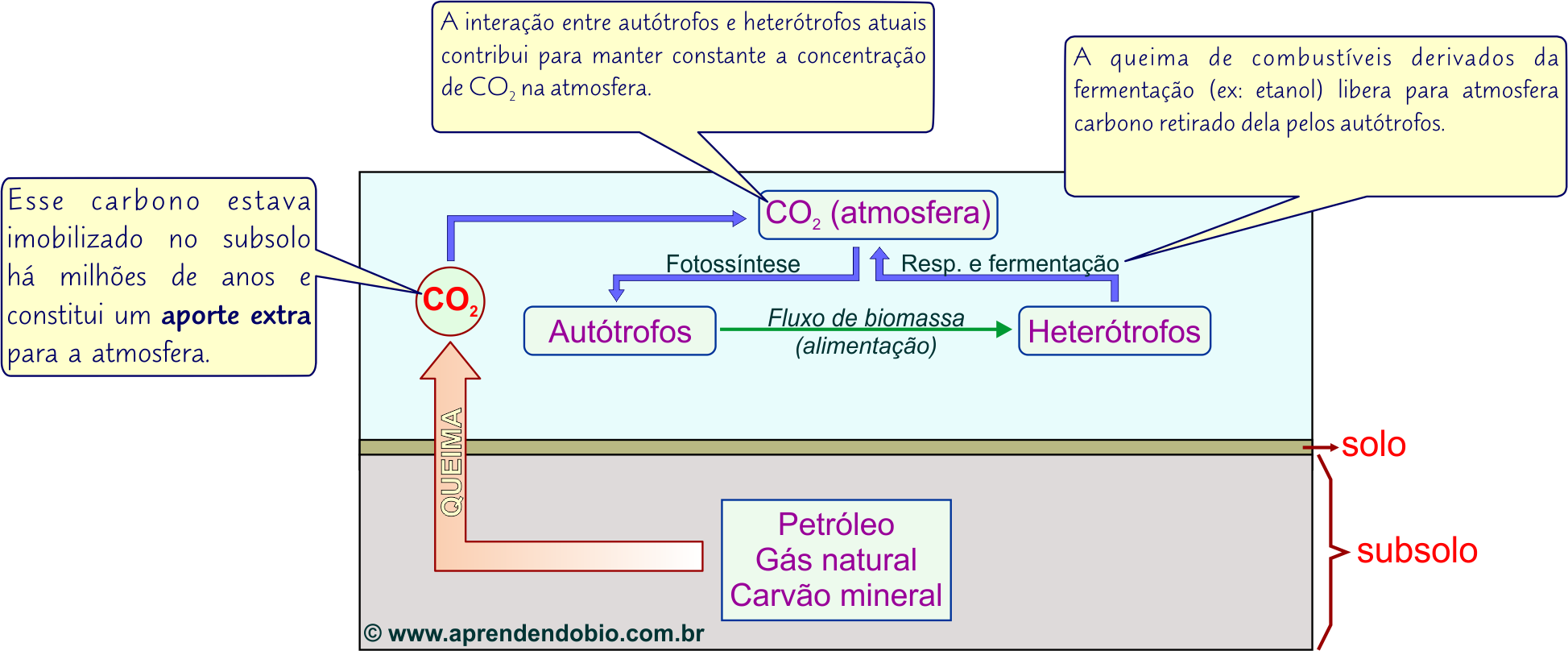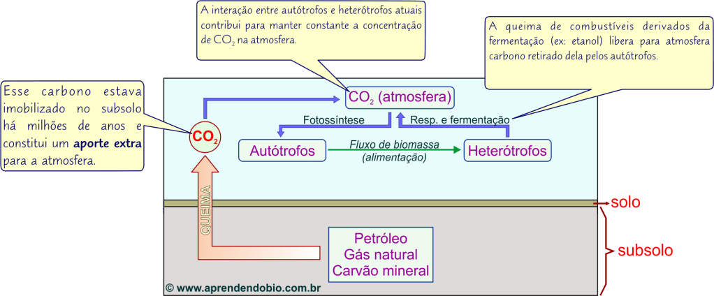 Organismos autótrofos e heterótrofos realizam processos complementares que associam os ciclos do carbono e do oxigênio. O carbono fixado pela energia luminosa ou a partir de compostos inorgânicos é eventualmente degradado pelos organismos, resultando em fontes de carbono como metano ou gás carbônico. Ainda, outros compostos orgânicos são catabolizados pelos seres, com menor rendimento energético, produzindo compostos secundários (subprodutos) que podem funcionar como combustíveis ambientais.