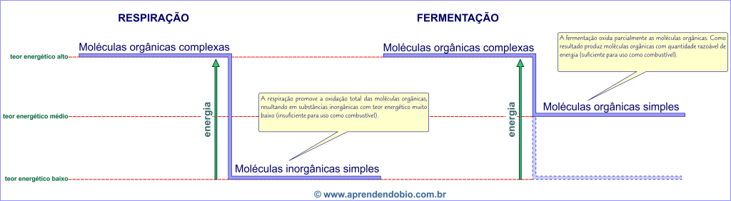 Na respiração celular – que pode ser aeróbica ou anaeróbica – as moléculas orgânicas são completamente oxidadas gerando substâncias inorgânicas com pouca energia. Por sua vez, a fermentação promove oxidação parcial dos compostos orgânicos resultando em produtos com razoável teor energético, como o etanol (no caso da fermentação alcoólica), que podem ser utilizados como combustíveis. Essa fonte de energia, comparada aos combustíveis fósseis (petróleo, carvão mineral e gás natural), é mais interessante do ponto de vista ambiental.