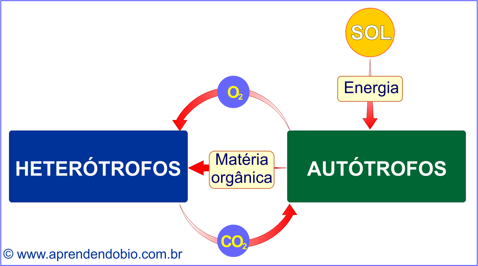 Nos ecossistemas, sejam terrestres ou aquáticos, encontramos organismos autótrofos e heterótrofos. Tais seres vivos estão inter-relacionados de diversas formas, como por exemplo, por meio dos ciclos biogeoquímicos, tais como os do carbono e do oxigênio.