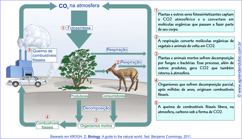 Moléculas fundamentais para os seres vivos, tais como carboidratos, proteínas, lipídeos, dentre outras, contêm carbono em sua estrutura. Esse elemento está presente, também, no meio abiótico: como gás carbônico (dióxido de carbono ou CO2) na atmosfera e sob a forma de íons carbonato (CO3-2) e bicarbonato (HCO3) dissolvidos nas águas de lagos, rios e, principalmente, oceanos. Além disso, há carbono nas moléculas de carbonato de cálcio (CaCO3) em estruturas calcárias em certos organismos vivos e constituindo as rochas sedimentares.