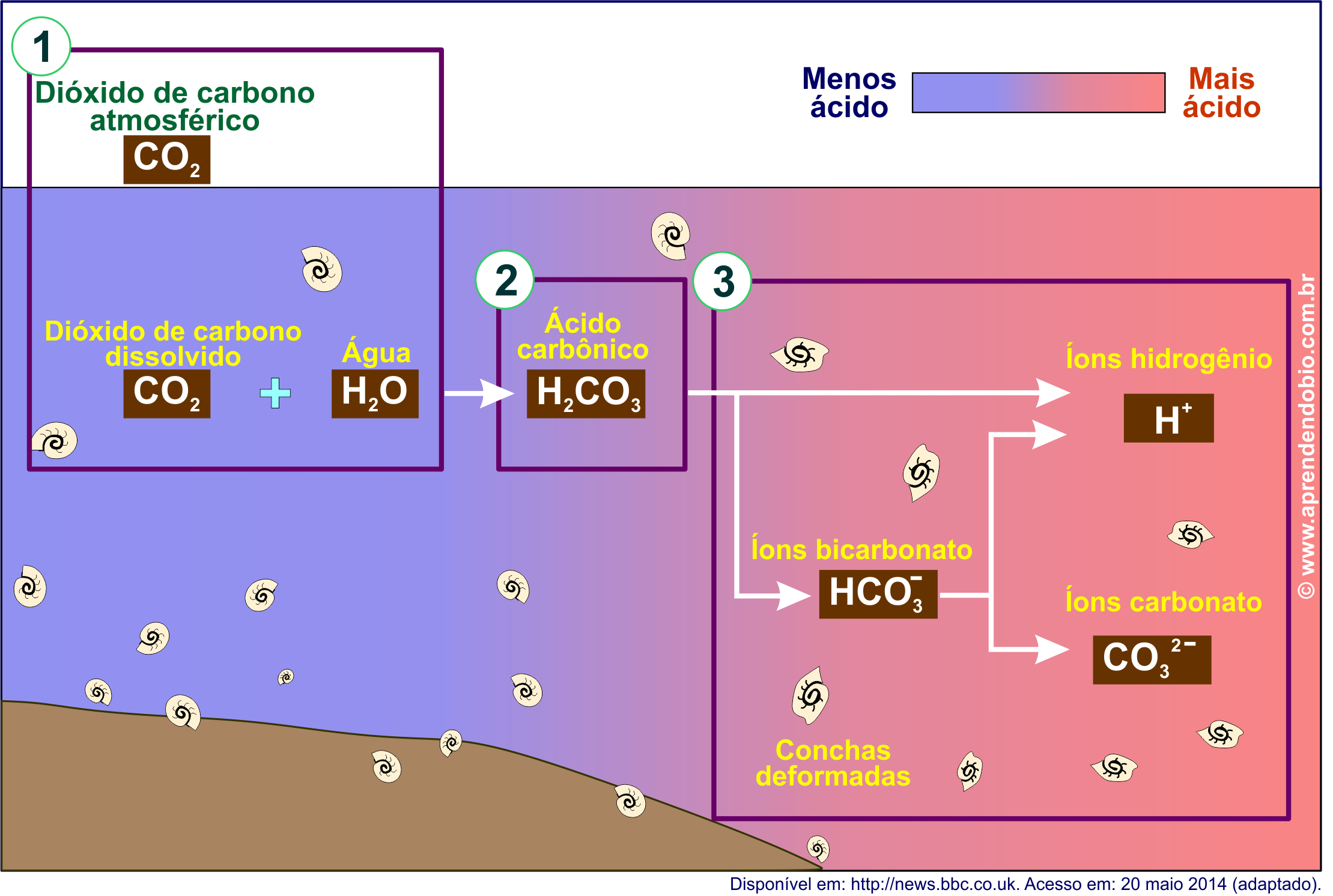 Com maior concentração de CO2 na atmosfera, uma maior quantidade irá se difundir para as águas oceânicas. Isso irá resultar em concentração aumentada de ácido carbônico que, por sua vez, gera maior quantidade de H+.