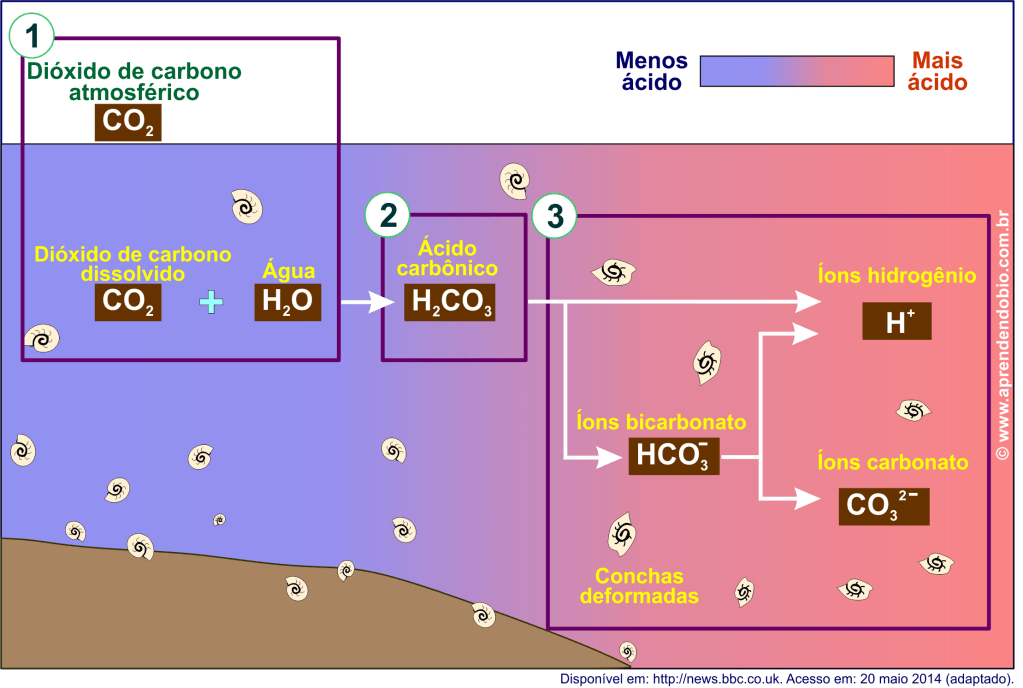 Uma quantidade significativa do dióxido de carbono da atmosfera move-se, principalmente por difusão simples, para as águas oceânicas superficiais. Esse gás, então, reage com a água produzindo ácido carbônico (H2CO3) que se dissocia incialmente em H+ e HCO3 (bicarbonato). Em seguida, o bicarbonato gera H+ e CO3-2 (carbonato). A figura a seguir, utilizada em questão da prova do ENEM de 2014, ilustra esse processo.