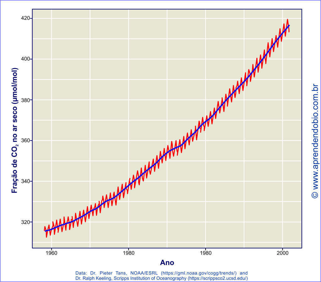 Curva de Keeling: demonstra o aumento da concentração atmosférica de CO2 nas últimas décadas. Clique na imagem para ampliar.