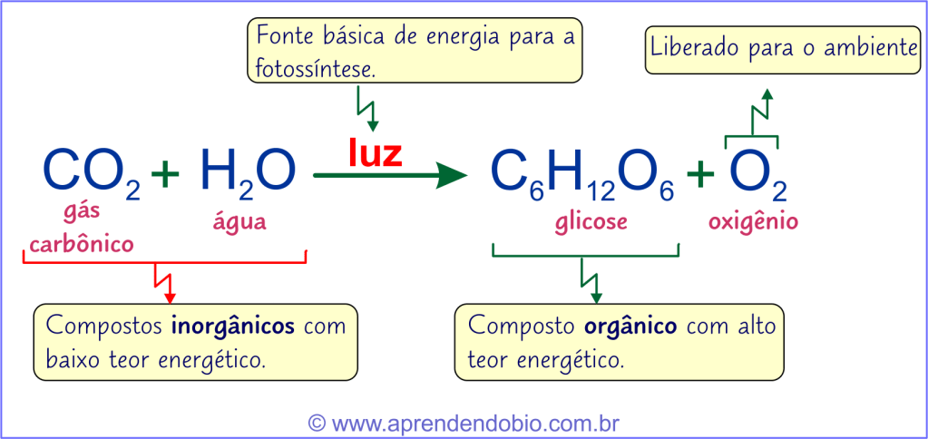Percebe-se, pela análise da figura acima, que o processo fotossintético (como ocorre em vegetais, algas e cianobactérias) tem como produtos a glicose e o oxigênio. Glicose e outros compostos orgânicos constituem a matéria orgânica que será incorporada à biomassa ou utilizada como fonte de energia para o organismo. Já o oxigênio é liberado para o ambiente.