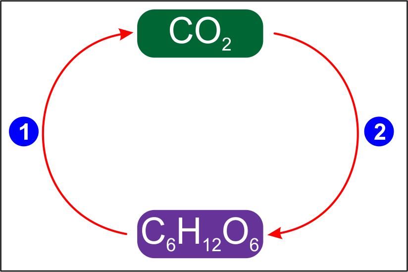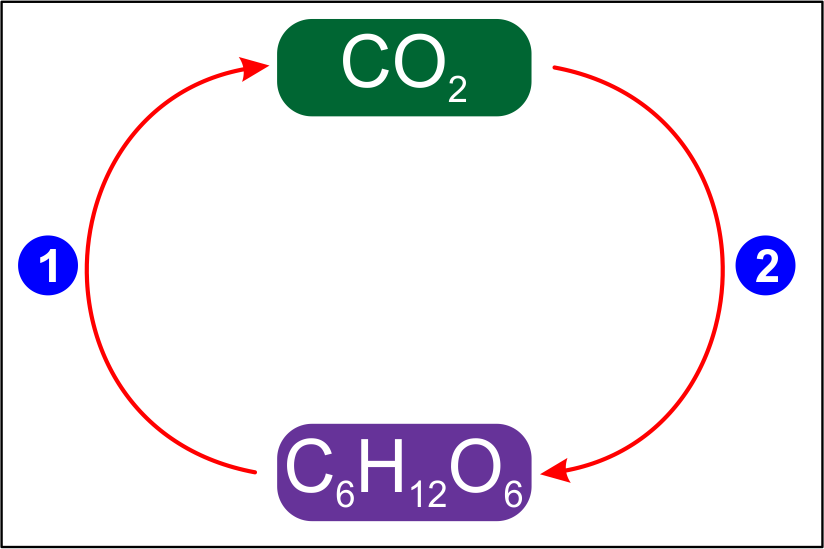 Na figura apresentada pela questão proposta, temos o processo 1 que utiliza matéria orgânica (C6H12O6) e libera gás carbônico (CO2), enquanto 2 consome esse gás para gerar matéria orgânica. A partir disso, podemos concluir que 1 representa um processo como a respiração celular e 2 corresponde à fotossíntese.