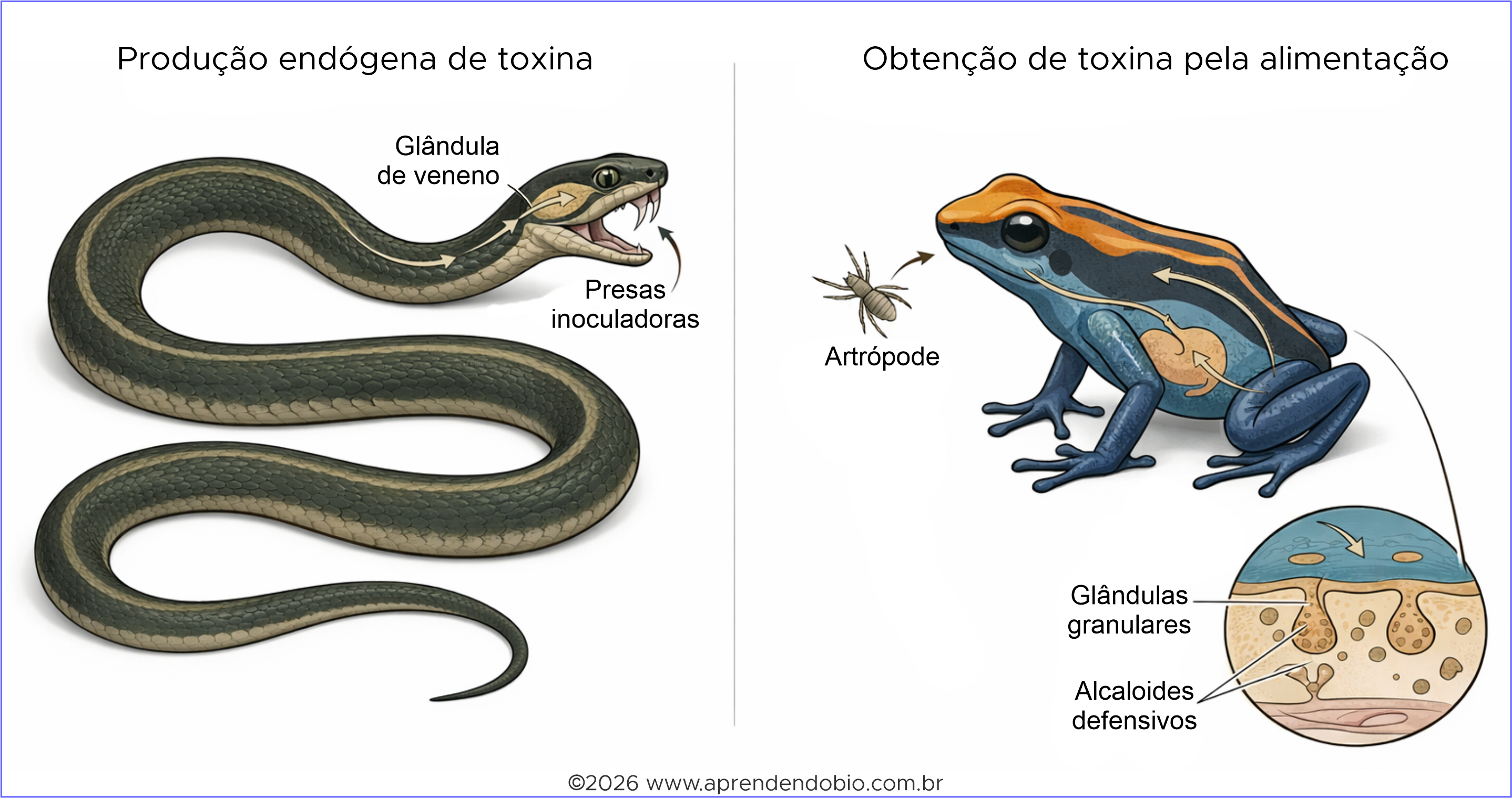 A comparação entre os dois mecanismos mostra com clareza duas estratégias biológicas distintas. À esquerda, a substância é produzida pelo próprio corpo e conduzida a um aparelho inoculador. À direita, o anfíbio depende de compostos obtidos externamente e associados depois ao tegumento. Em uma situação, a defesa química resulta de síntese interna. Na outra, depende de uma rede ecológica que fornece o material químico necessário.