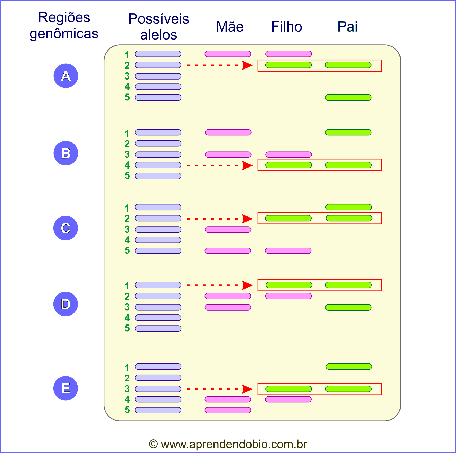 Sendo assim, em cada região genômica do filho, um alelo do par provém da mãe e o outro foi herdado do pai. Para sabermos a origem (materna ou paterna) de cada alelo do par, devemos analisar a figura fornecida. Na região genômica A, por exemplo, o filho exibe um alelo do tipo 1 (dentre os cinco possíveis) e um do tipo 2. É possível constatar que, para essa mesma região, a mãe exibe dois alelos do tipo 1 (por isso, ela apresenta apenas uma banda 1), enquanto o pai possui um alelo do tipo 2 e um do tipo 5. A partir desses dados, podemos concluir que o alelo 1 do filho só pode ser proveniente da mãe (uma vez que o pai não tem essa variedade). Já o outro alelo do par encontrado no filho (alelo tipo 2) foi herdado necessariamente do pai, pois a mãe não possui essa variedade na região A de seu genoma. Aplicando o mesmo raciocínio às demais regiões genômicas apresentadas, conseguiremos determinar a origem (materna ou paterna) de cada componente dos pares de alelos.