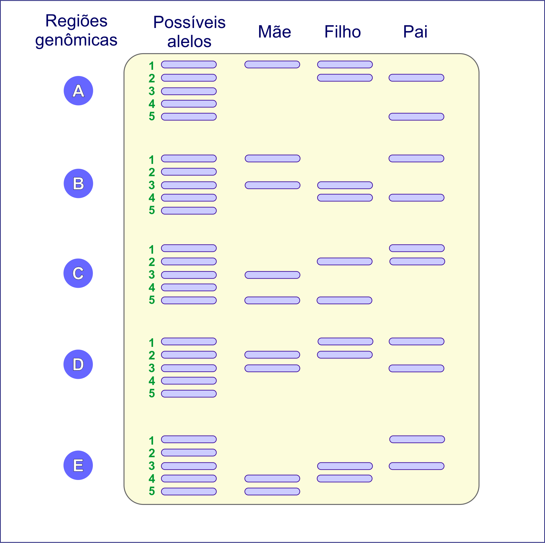 A figura apresenta as regiões genômicas (com seus respectivos os alelos) para a mãe, filho e pai. Para cada região genômica há cinco tipos possíveis de alelos. Os alelos, representados como bandas horizontais na figura, são variações da sequência de nucleotídeos das moléculas de DNA que constituem os cromossomos. Portanto, cada um dos indivíduos analisados exibe um par de alelos para cada uma as regiões genômicas consideradas. Além disso, cada alelo do par é proveniente de um dos genitores das pessoas analisadas.