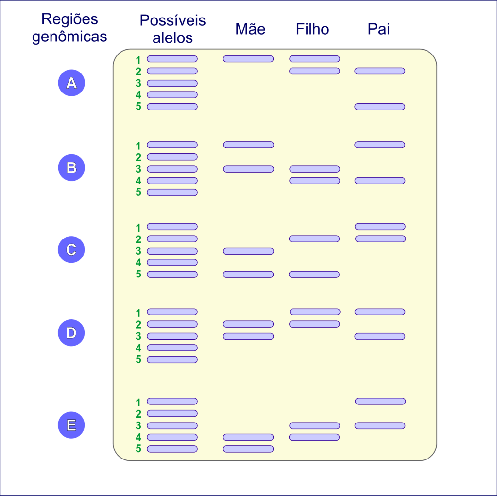 Na investigação de paternidade por análise de DNA, avalia-se o perfil genético da mãe, do suposto pai e do filho pela análise de regiões do genoma das pessoas envolvidas. Cada indivíduo apresenta um par de alelos, iguais ou diferentes, isto é, são homozigotos ou heterozigotos, para cada região genômica. O esquema representa uma eletroforese com cinco regiões genômicas (classificadas de A a E), cada uma com cinco alelos (1 a 5), analisadas em uma investigação de paternidade: