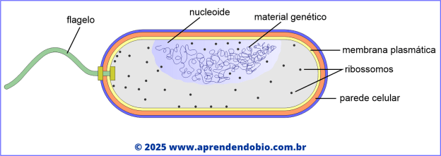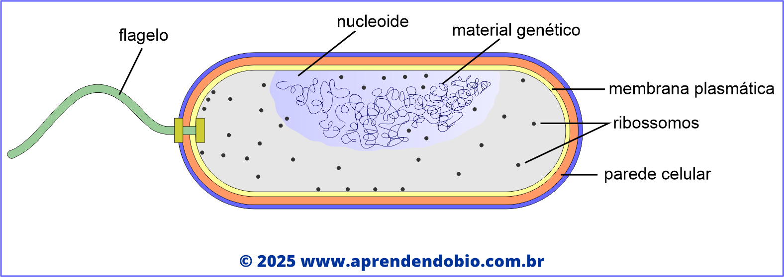 As células procariontes (Figura 3) apresentam uma estrutura mais simples e estão entre as formas de vida mais antigas conhecidas. Elas não possuem núcleo, e por isso o material genético fica disperso no citoplasma. Também não possuem organelas membranosas, como as encontradas em células eucariontes. A única organela presente é o ribossomo, responsável pela síntese de proteínas.