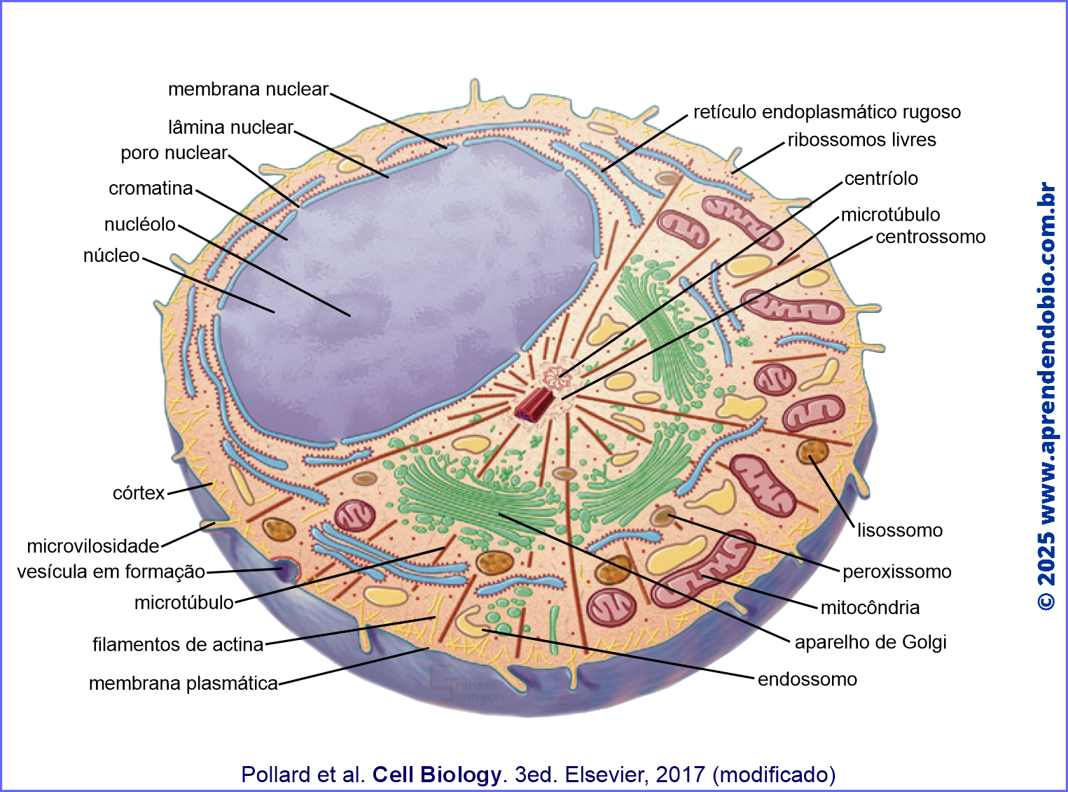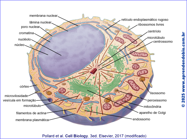 Todas as células são envolvidas por uma membrana plasmática, formada por lipídios e proteínas. Essa estrutura separa o conteúdo interno da célula do meio externo e controla a entrada e saída de substâncias. No interior da célula encontra-se o citoplasma, que inclui todas as estruturas celulares, com exceção do núcleo nas células eucariontes. O citoplasma é composto por organelas e por um fluido chamado citosol, no qual essas organelas estão imersas.