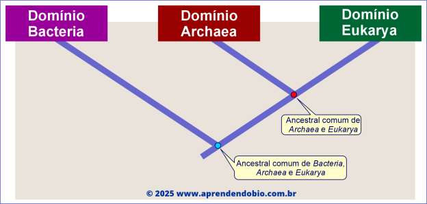 O ancestral comum dos três domínios da vida — Bacteria, Archaea e Eukarya — é conhecido como LUCA, sigla em inglês para Last Universal Common Ancestor (último ancestral comum universal). Estima-se que LUCA tenha vivido há cerca de 3,5 a 4 bilhões de anos, em uma época em que as condições da Terra ainda eram extremas. Esse organismo primitivo já possuía material genético em forma de DNA, ribossomos para síntese de proteínas e um sistema de tradução de informações genéticas, características que permanecem em todos os seres vivos atuais. Os fósseis mais antigos de procariontes têm cerca de 3,5 bilhões de anos, o que mostra que formas de vida simples e celulares já existiam relativamente pouco tempo após a formação da crosta terrestre. Esses registros revelam que, mesmo nos primeiros capítulos da história da vida, os procariontes apresentavam grande diversidade metabólica e estavam adaptados a uma ampla variedade de ambientes. A partir de LUCA, diferentes linhagens evolutivas se diversificaram, dando origem aos três grandes domínios da vida — um processo que reflete a profunda unidade biológica da vida na Terra.